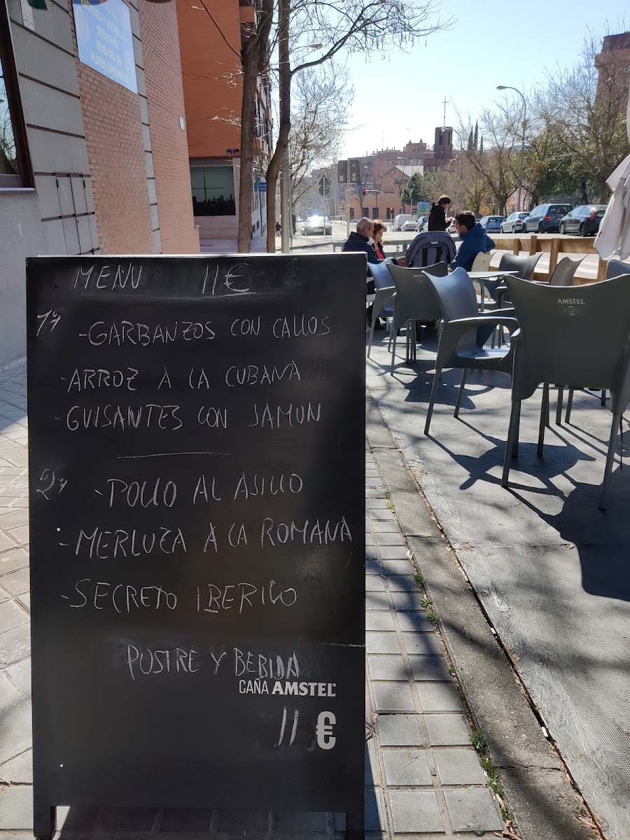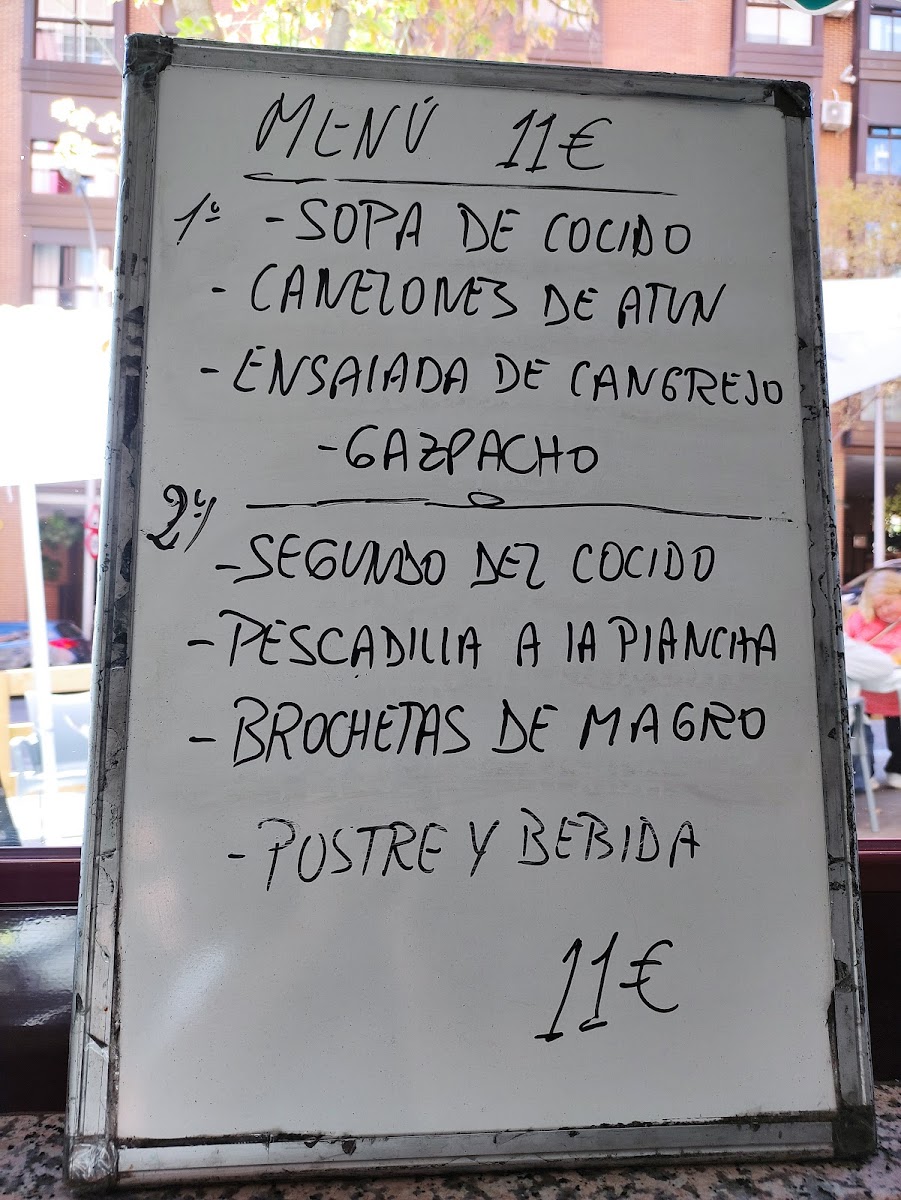 For lunch and casual dining, the menu provides a selection of simple, market-style dishes including traditional Spanish options such as codillo asado, lomo de cerdo a la plancha, paella, and cazón en adobo. There are also homemade desserts available, for example, pudin casero.